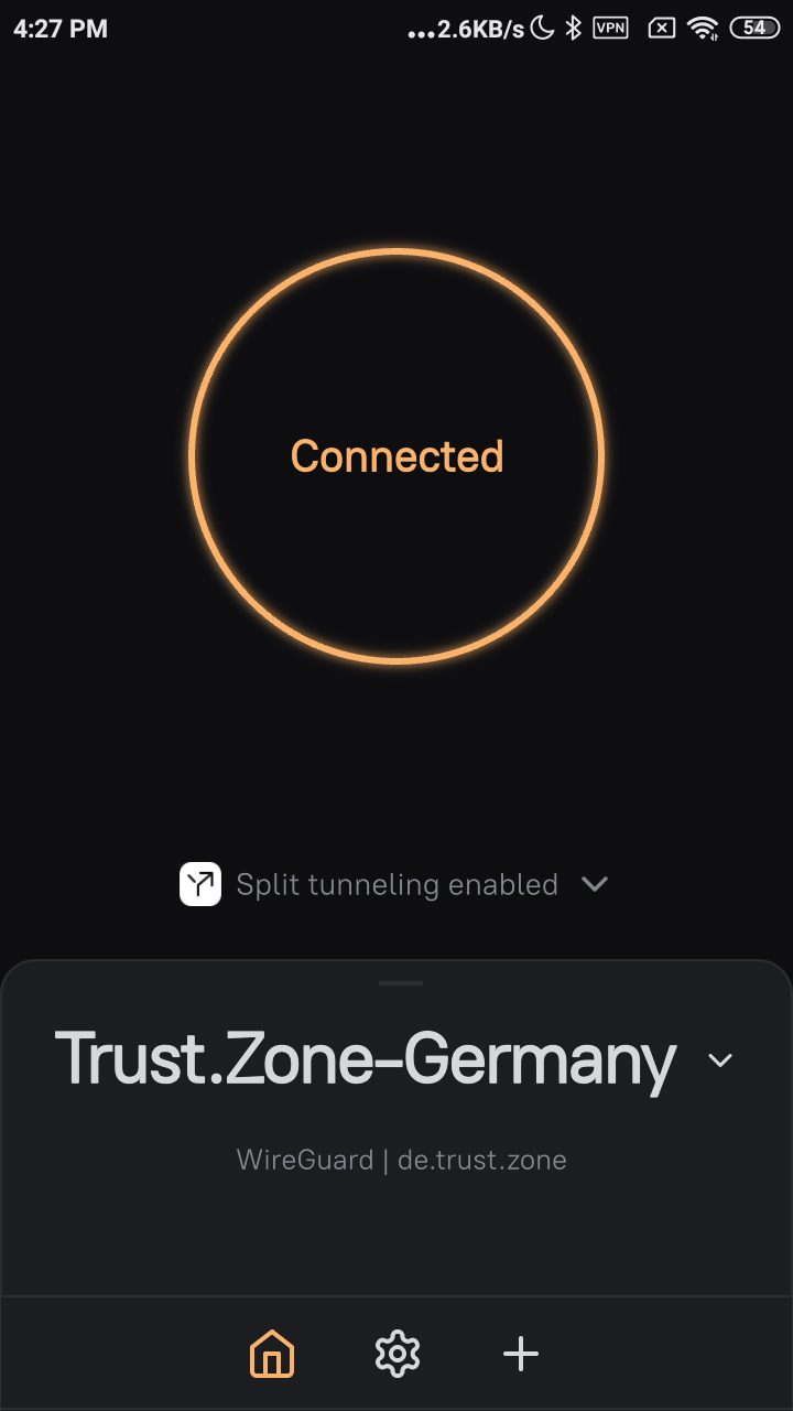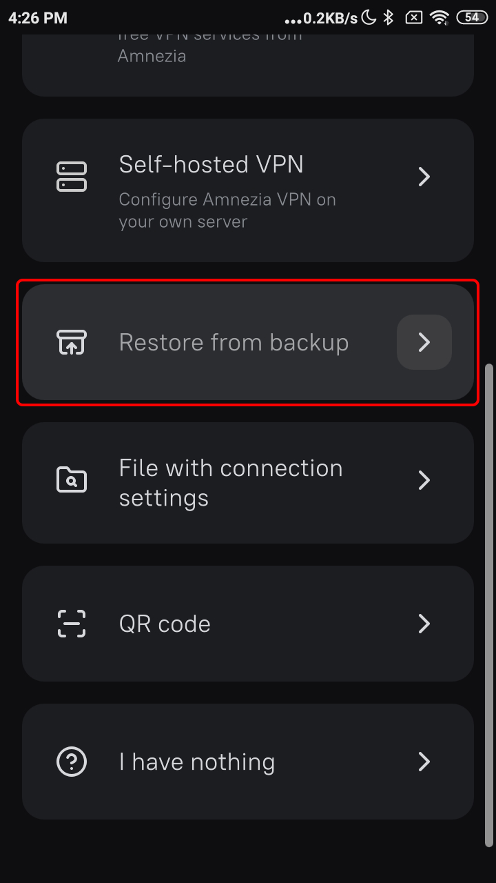 Ejecute la aplicación AmneziaVPN , toque el botón Comencemos , luego toque el botón Restaurar desde la copia de seguridad y seleccione el archivo Trust.Zone_Amnezia_WireGuard.backup descargado.