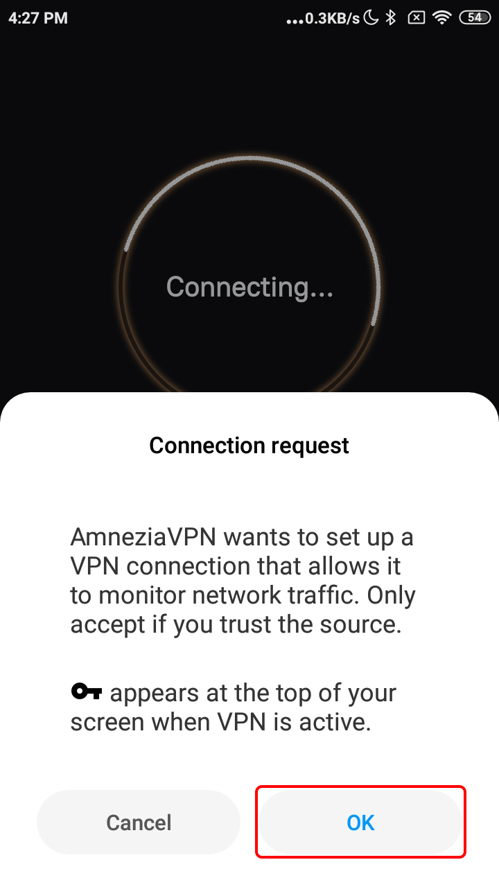 Toque OK para permitir que la aplicación AmneziaVPN agregue la configuración de VPN a Android.
