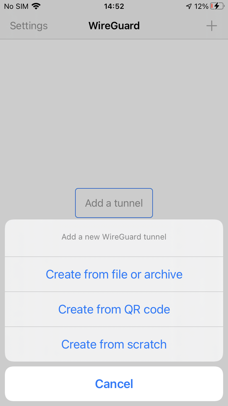 Exécutez l’application WireGuard , appuyez sur le bouton Ajouter un tunel , puis sur le bouton Créer à partir d’un fichier ou d’une archive .