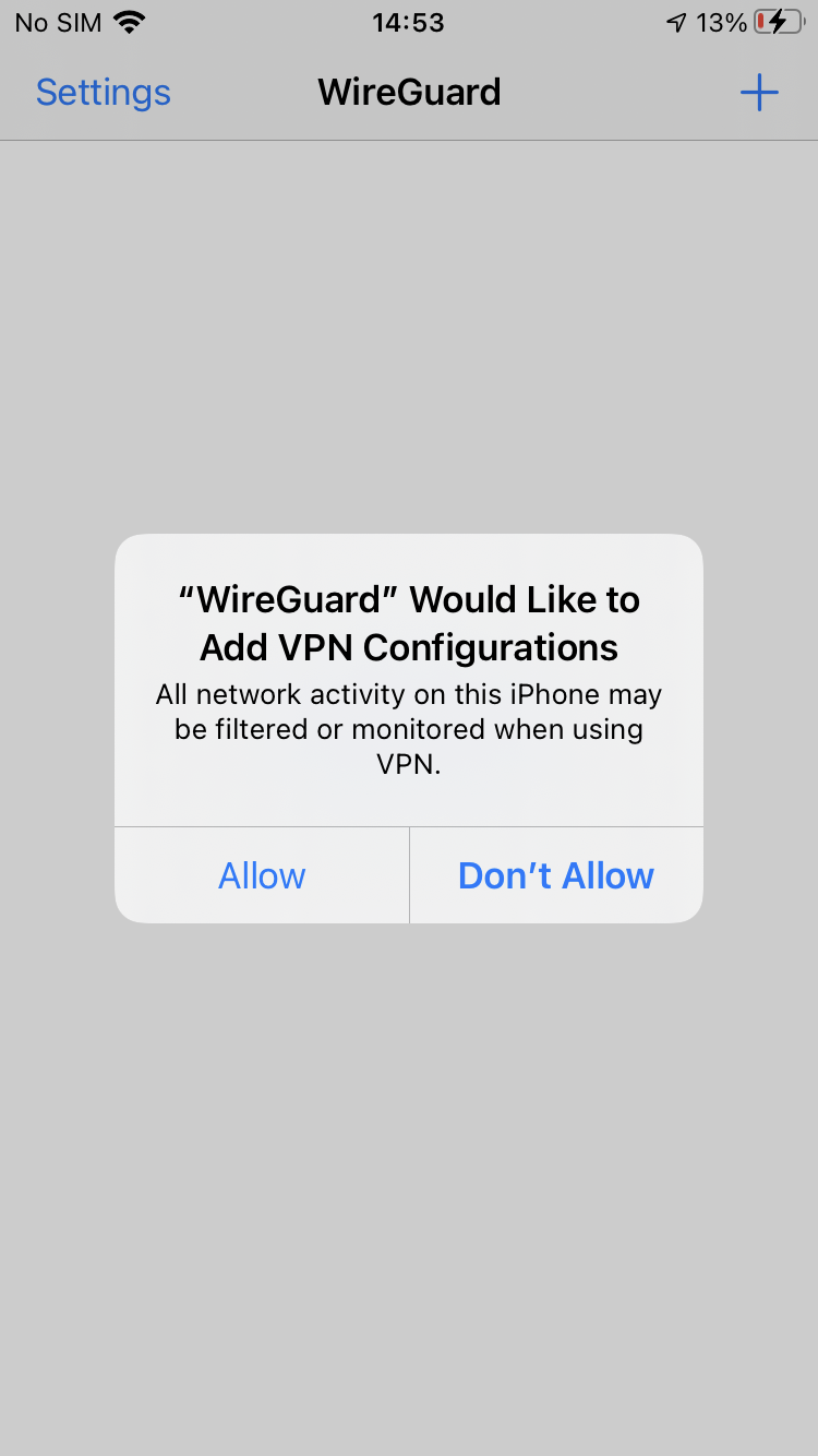 Appuyez sur Autoriser afin d’autoriser l’application WireGuard à ajouter une configuration VPN dans iOS.