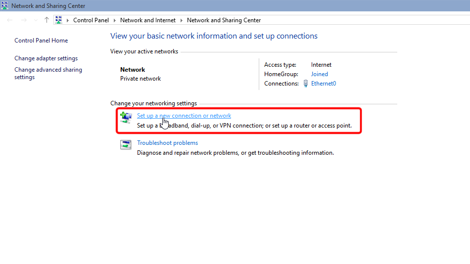 Cliquez sur « Configurer une nouvelle connexion ou un nouveau réseau ».