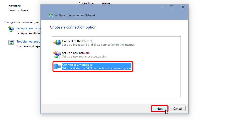 Sélectionnez « Se connecter à un lieu de travail » et cliquez sur « Suivant ».