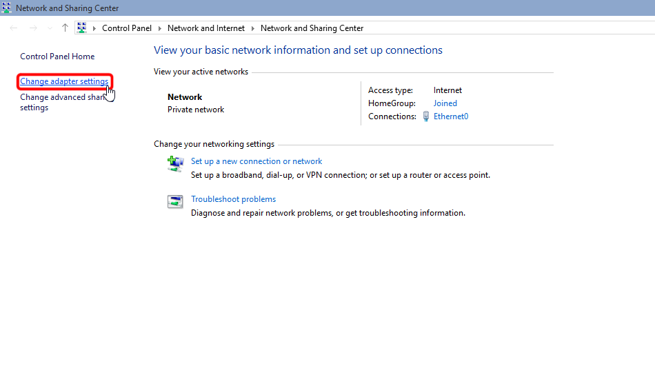Ouvrez le Centre Réseau et Partage et cliquez sur « Modifier les paramètres de l’adaptateur ».