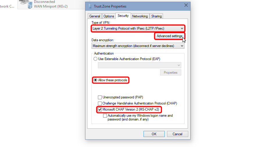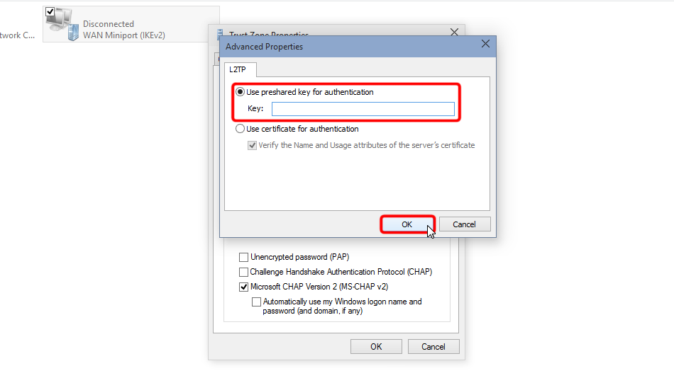 Set "Use preshared key for authentication", it is: trustzone
