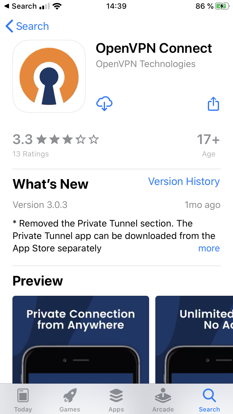 Faites défiler vers la droite pour trouver l’icône de l’application OpenVPN . S’il n’y a pas d’application OpenVPN , appuyez sur l’icône Plus (...).