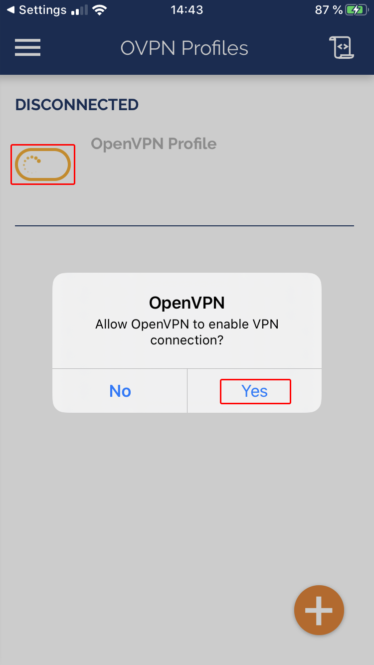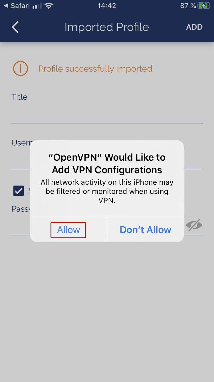 Appuyez sur Autoriser afin d’autoriser l’application OpenVPN Connect à ajouter une configuration VPN dans iOS.