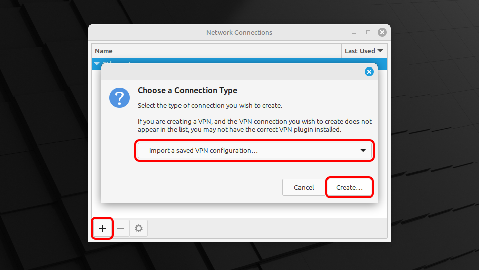 Sélectionnez « Importer une configuration VPN enregistrée... et cliquez sur « Créer »