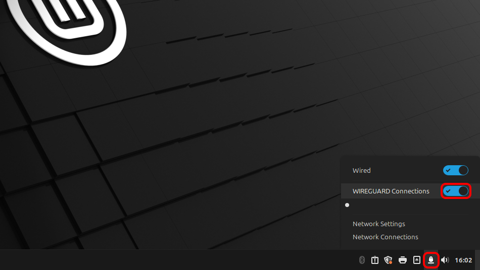 Cliquez sur l’icône du menu réseau et désactivez l’interrupteur « Connexions WIREGUARD ».