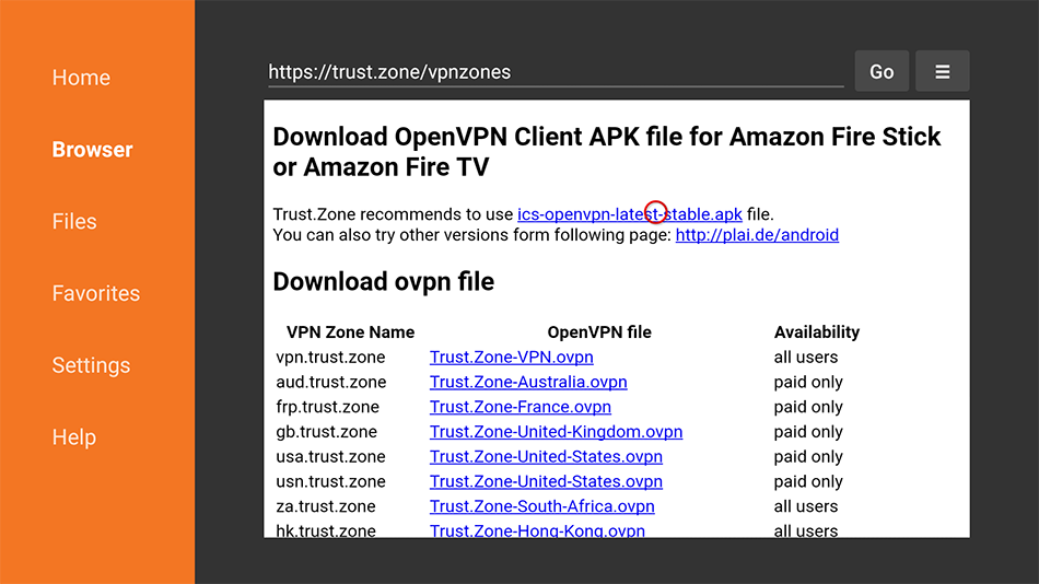 Switch Browser from left pane, type the following address: https://trustedzone.info/vpnzones then press Go