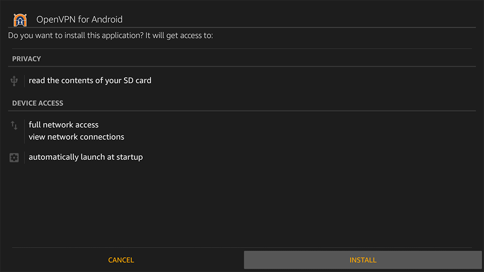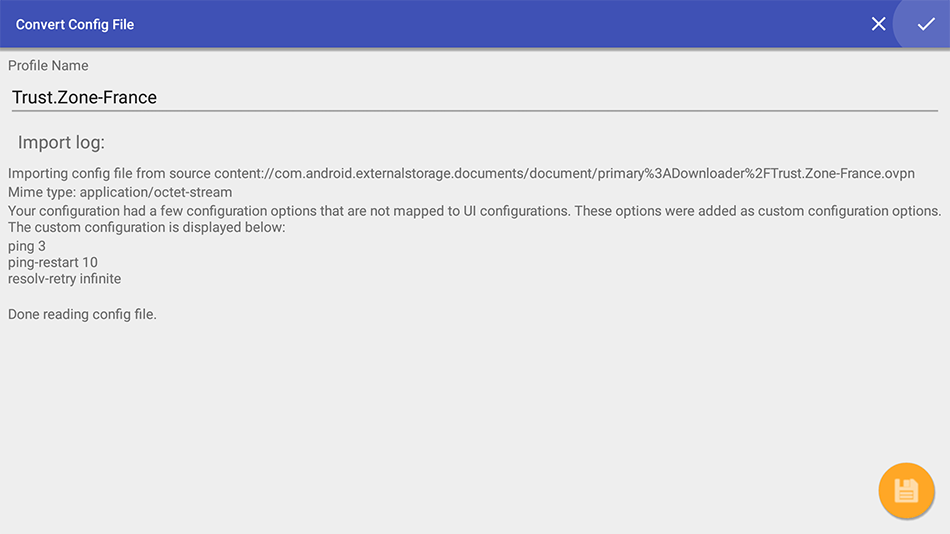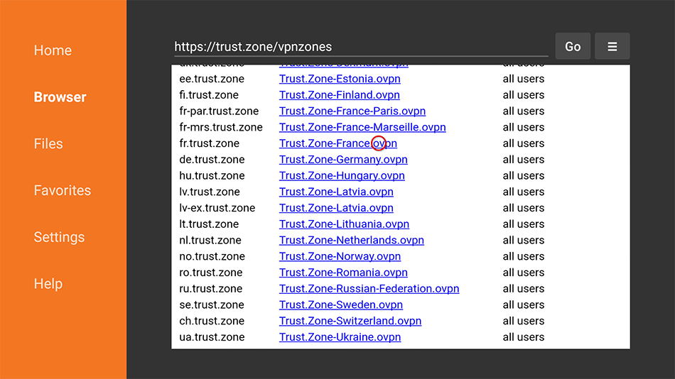 In Downloader app Browser select desired VPN location and click it to download OpenVPN config file (.ovpn file).