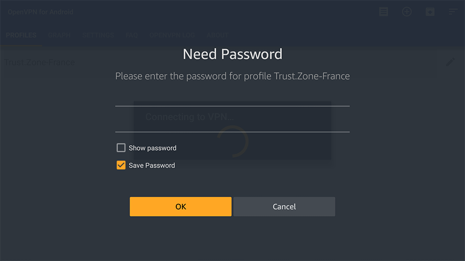 Type your VPN username and VPN password, enable Save Password option and press OK to connect.