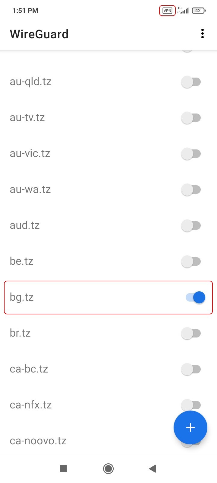 WireGuard tunnels list will be filled with the Trust.Zone locations, select desired VPN location and tap the switch ner location name to connect.