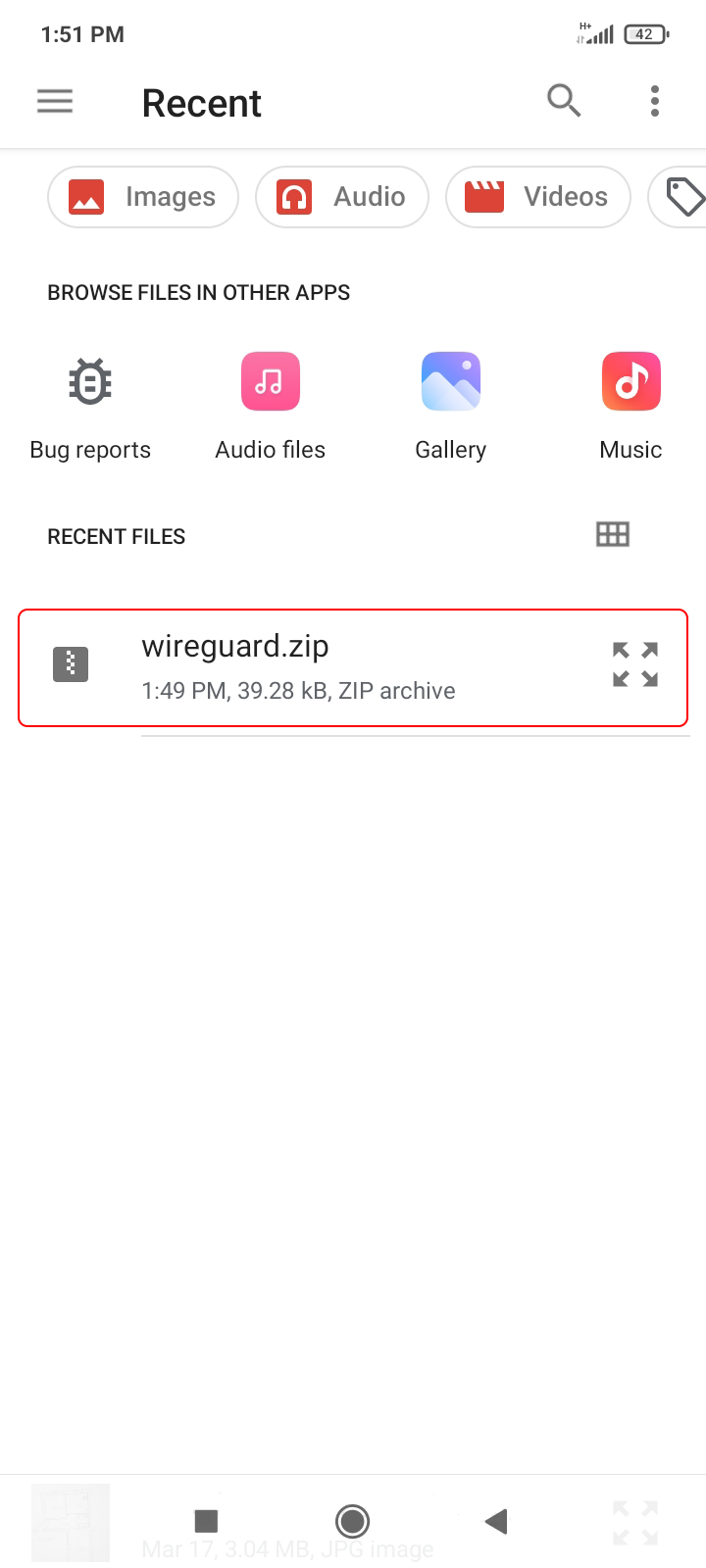 Navigate to the wireguard.zip file you've downloaded before and select it. You may need to perform a long tap on the wireguard.zip file in order to select the zip archive itself instead of opening it. Short tap may open the archive and show its contents which is not what we need.