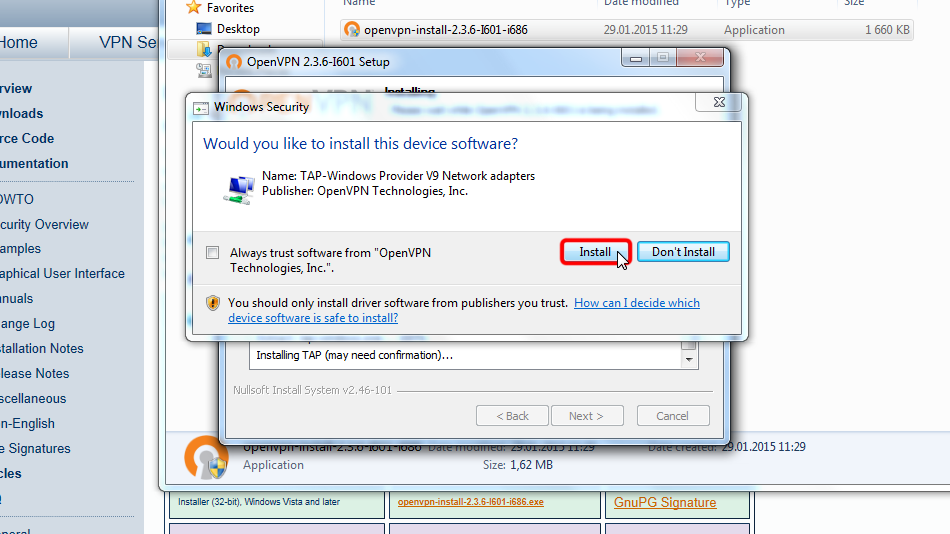 This will install TAP-Windows Provider V9 Network adapter needed for OpenVPN to work.
