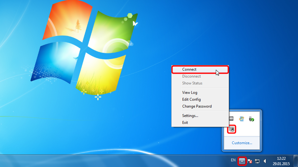 In case you have multiple connections configured. Right click OpenVPN tray icon, select location you want to connect and click "Connect".