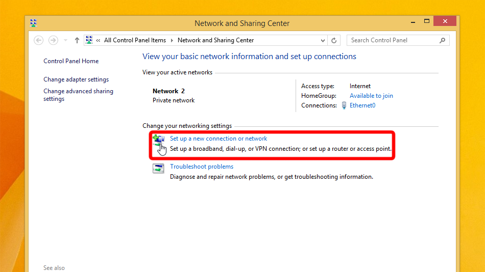 Right click on the network icon in the system tray and then click "Open Network and Sharing Center".