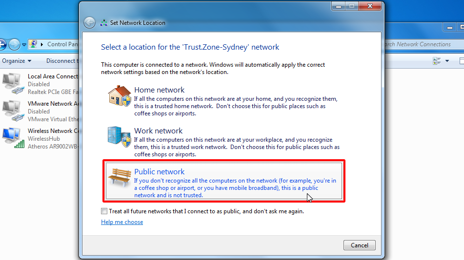 Ekran görüntüsündeki gibi Ağ Konumunu Ayarla iletişim kutusuna sahip olmanız durumunda Genel ağ'ı seçin.