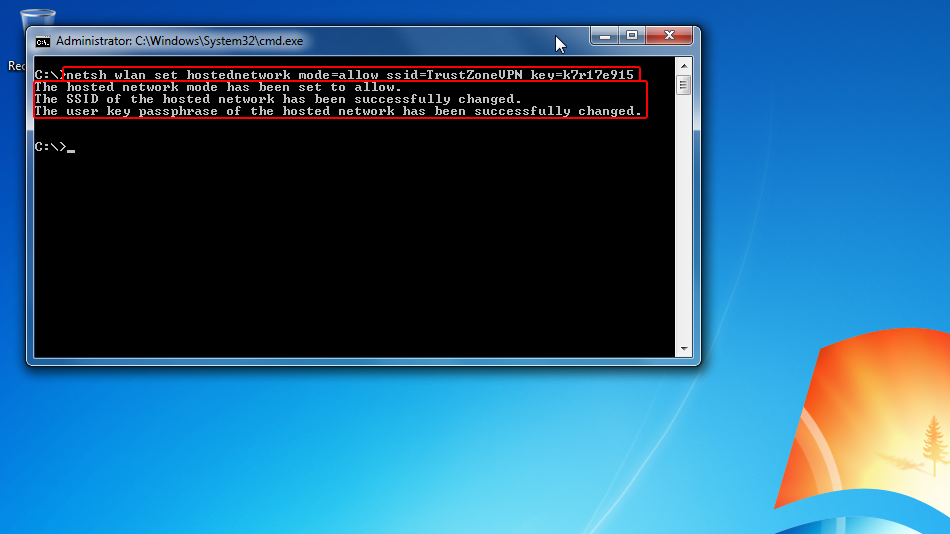 Aynı komut satırında netsh wlan set hostednetwork mode=allow ssid=TrustZoneVPN key=k7r17e915 komutunu çalıştırın.