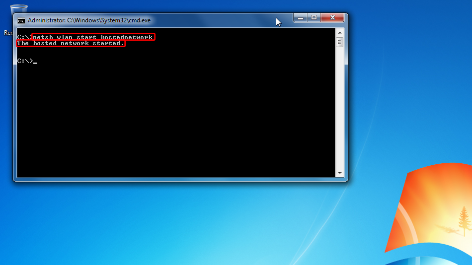 Bilgisayarınızda kablosuz erişim noktasını çalıştırmak için netsh wlan start hostednetwork komutunu çalıştırın.
