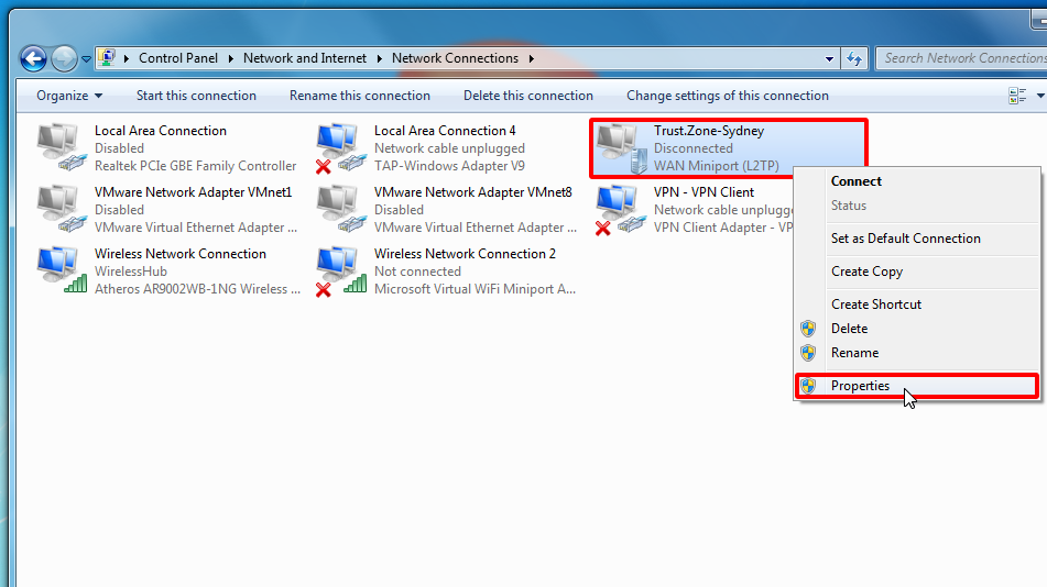 1. adımda oluşturduğunuz L2TP VPN Bağlantısı'na sağ tıklayın ve ardından Özellikler'e tıklayın.
