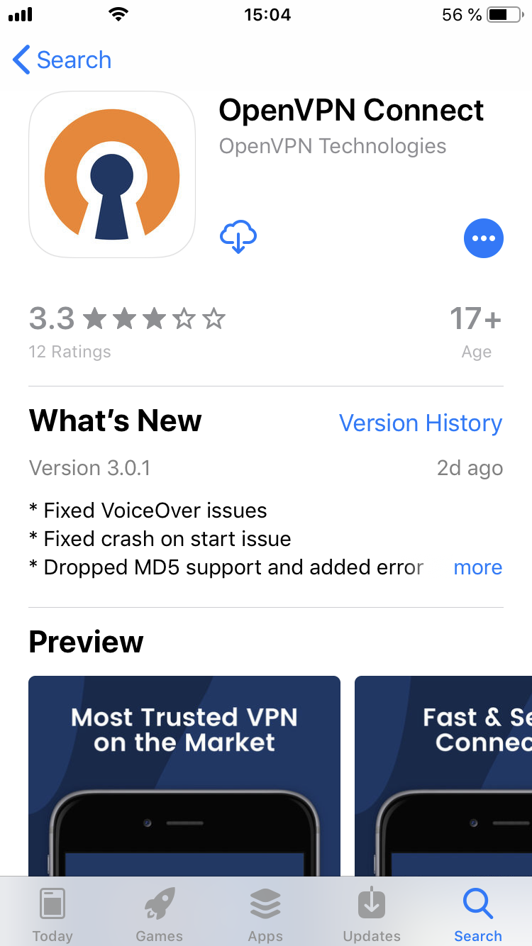 OpenVPN Connect uygulamasını AppStore'e from olarak yükleyin.