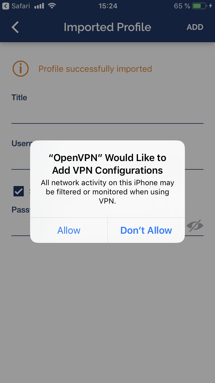 OpenVPN Connect uygulamasının iOS'a VPN yapılandırması eklemesine izin vermek için İzin Ver'e dokunun.