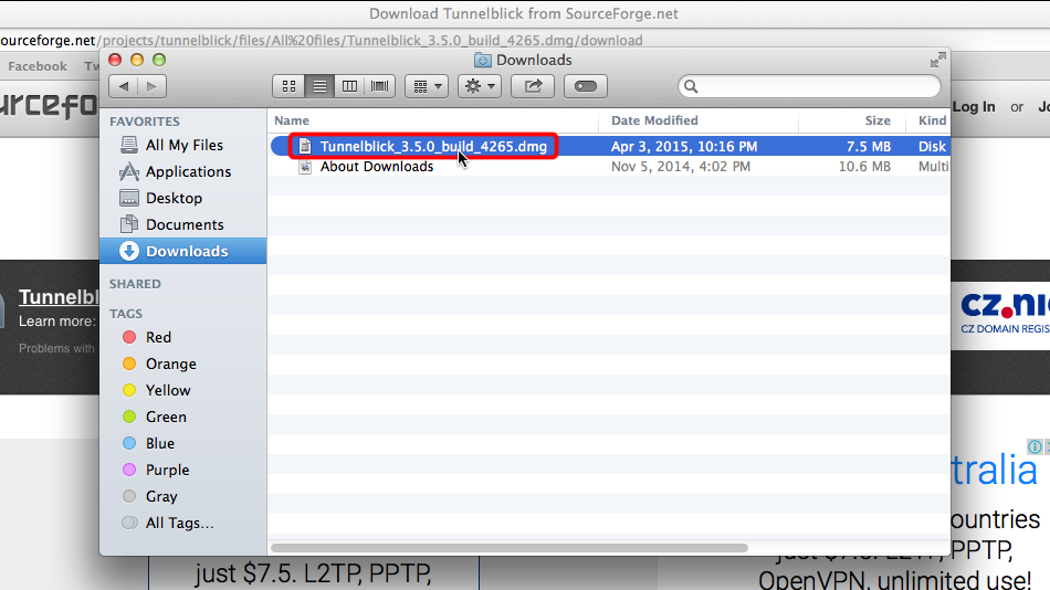 Finder'da "İndirilenler"e gidin ve indirilen Tunnelblick dmg dosyasına çift tıklayın.